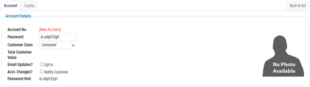 To create a new customer account, expand the Manage Accounts dropdown and select Create Account. The two checkboxes under the Account Details section configure email communication preferences for the customer.