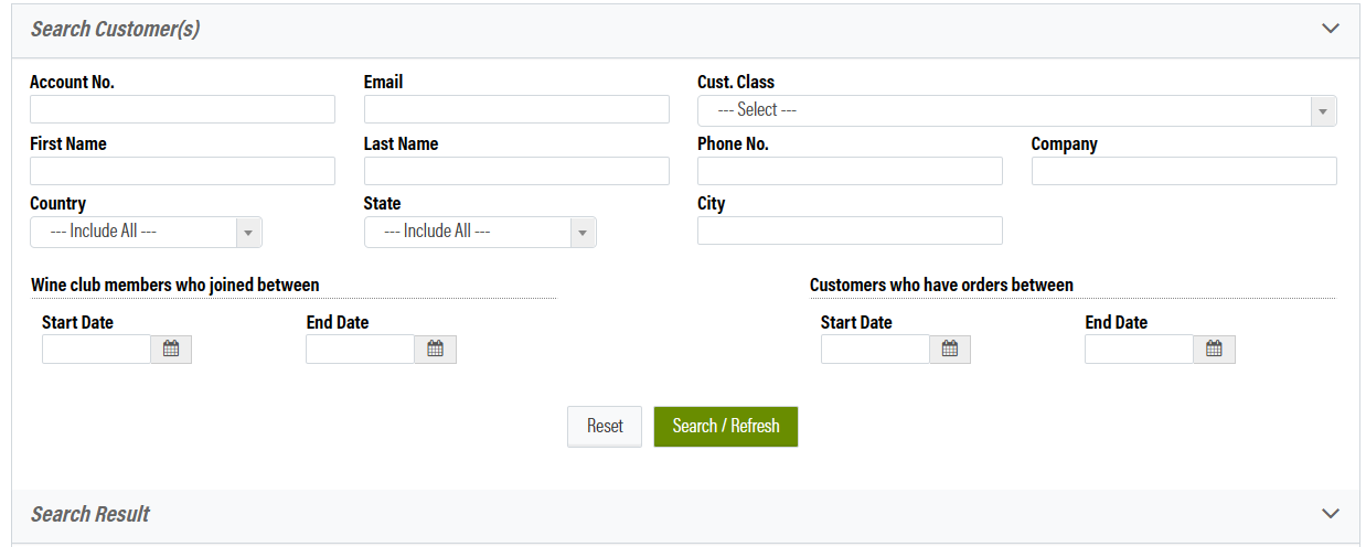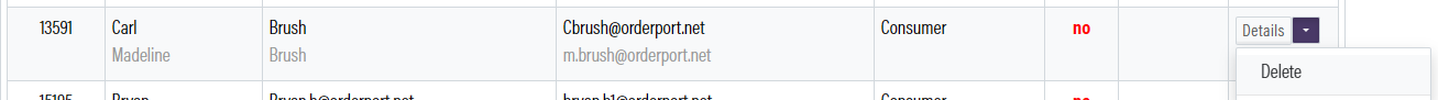 You can delete a customer account by opening the dropdown next to the Details button and clicking Delete. You cannot delete a customer who is a member of a wine club.