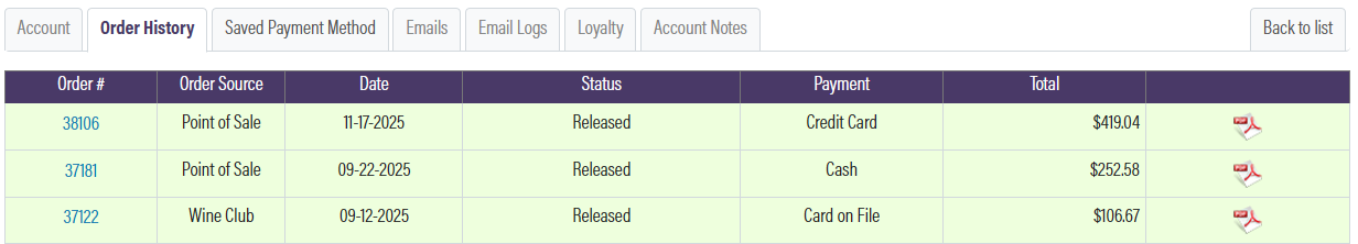 The Order History tab displays all orders for this customer. Click on the order number to view more information about a given order.