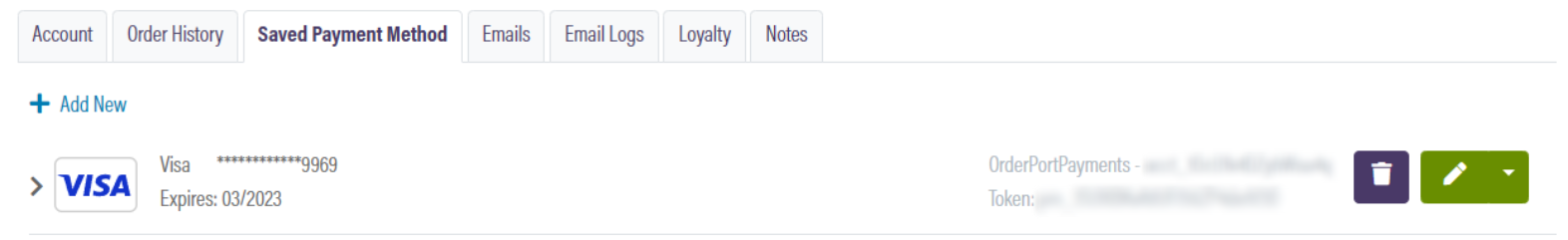Depending on your payment processor, the title of this tab may vary. In this tab, you can view saved payment methods, including credit cards and bank accounts.