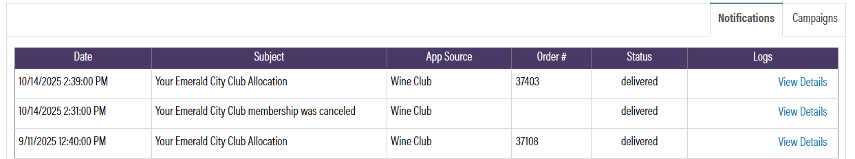 View sent emails in the Email Logs tab. Emails are organized in two sections: Notifications and Campaigns. You may resend an email by clicking View Details and opening the Emails tab.