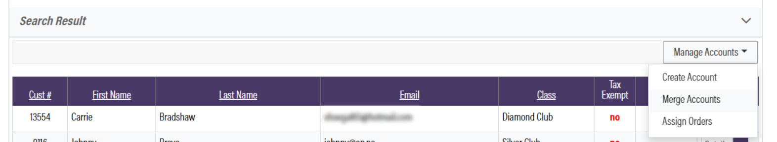 If you have duplicate customer accounts, you can combine them using the Manage Accounts dropdown.
