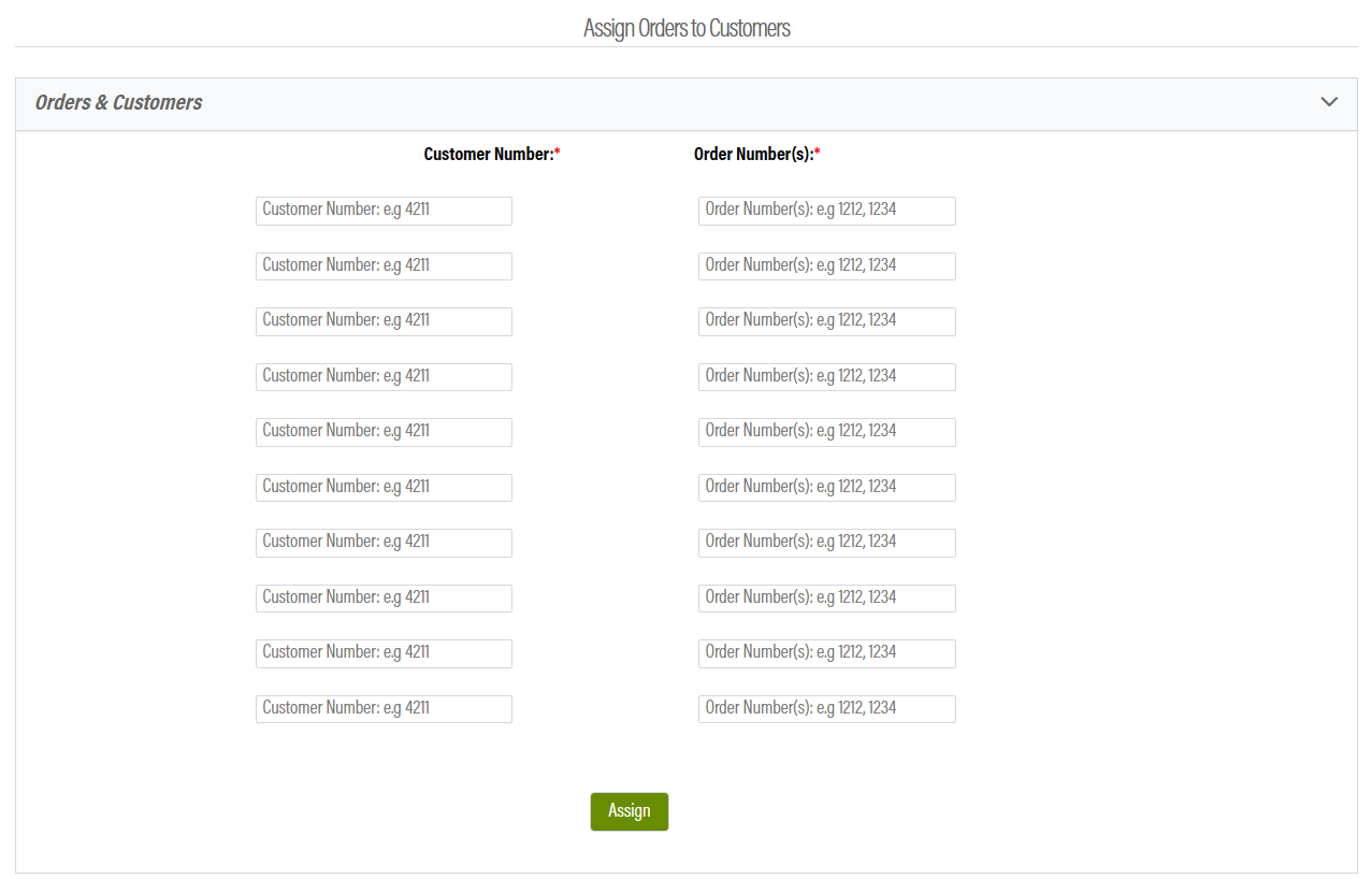 You can assign multiple orders to multiple accounts at once. Fill out as many assignments you need, then click Assign.