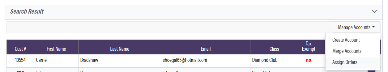 If you have orders that are unconnected to the proper customer account, expand the Manage Accounts dropdown and select Assign Orders.