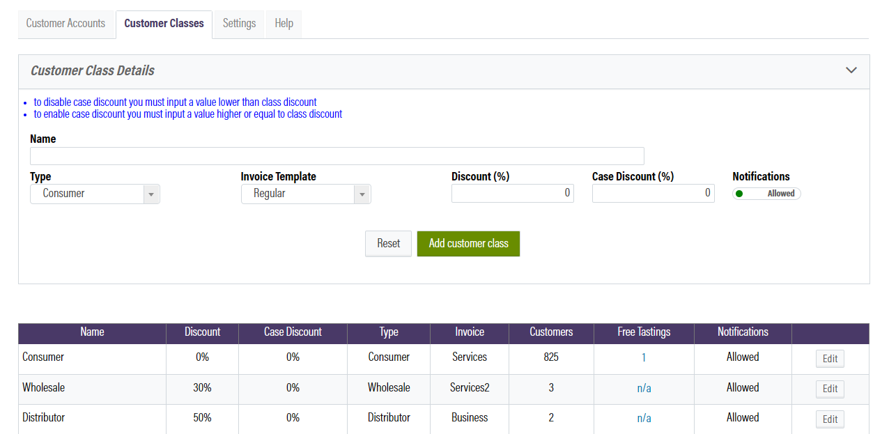 You can edit and create customer classes in the Customer Classes tab. To create a new class, fill in the information, then click "Add customer class".