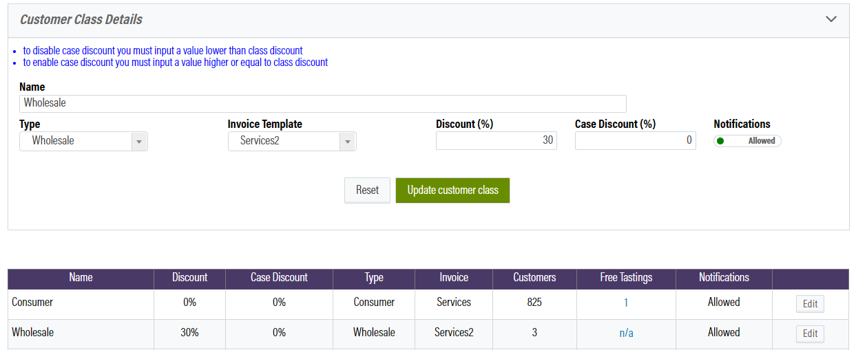 To edit an existing class, click edit, update the fields, then click "Update customer class".