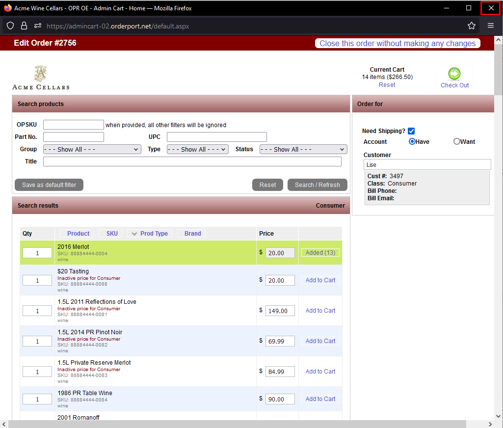 On the Admin side, go to the Customer Service module and search for the Order. On the Select drop-down menu, select Edit order which opens up Admin Cart. On the Admin Cart window, close it out do not press Close without making changes (if you want your order to be back in Progress).
