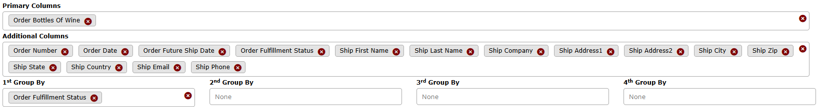 This report pulls all unreleased orders in the Fulfillment module. When running this type of report, make sure that you select at least one field in the Primary Columns section, e.g. Order Bottles Of Wine. That way, it will limit the columns and make the report more useful.