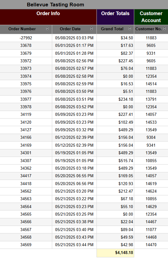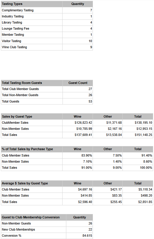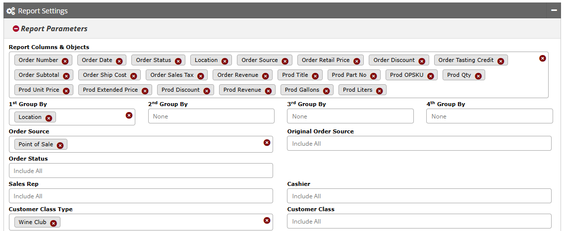 This report type displays customer free tasting information. The columns which you can choose from include customer and free tasting information. You can also filter results by customer class, club membership, and location.