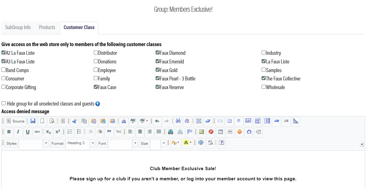 From here, you can select which customer classes have access to the group, and you can choose to hide the group from the menu all together. If you do not hide the group, all customers can see the option on the menu but will encounter the access-denied message.