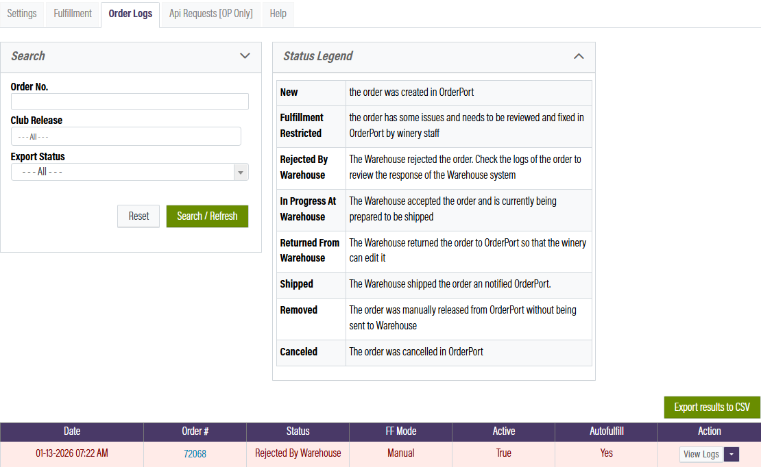 In some cases, orders may not successfully transfer from OrderPort to Wineshipping. If you included your email address in the Wineshipping settings tab in OrderPort, you will receive an alert of any errors that occur. You can also check for errors in Export History tab of the Wineshipping module in OrderPort.