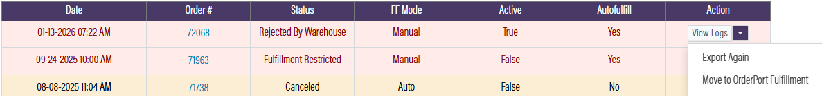 In the action column, you can view logs and take actions depending on the order. Logs are available on orders where an import is rejected. They will give useful information on what caused the rejection.