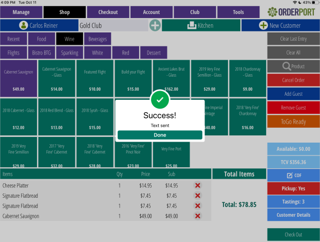 Once the order is prepared, tap the ToGo Ready button on the right[1]hand side of the Shop screen. OrderPort will send a text message to the customer’s phone number to let them know that their order is ready.