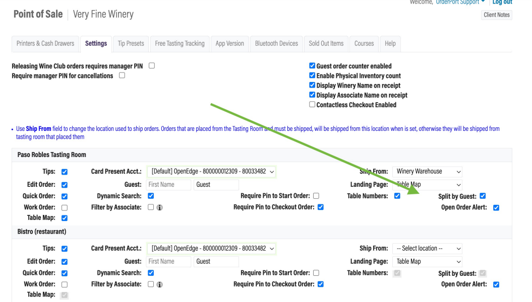 In OrderPort admin, navigate to the Point of Sale module, then click the Settings tab. Check the boxes next to Table Numbers and Split by Guest. If you have multiple locations, make sure you check the boxes for each location.