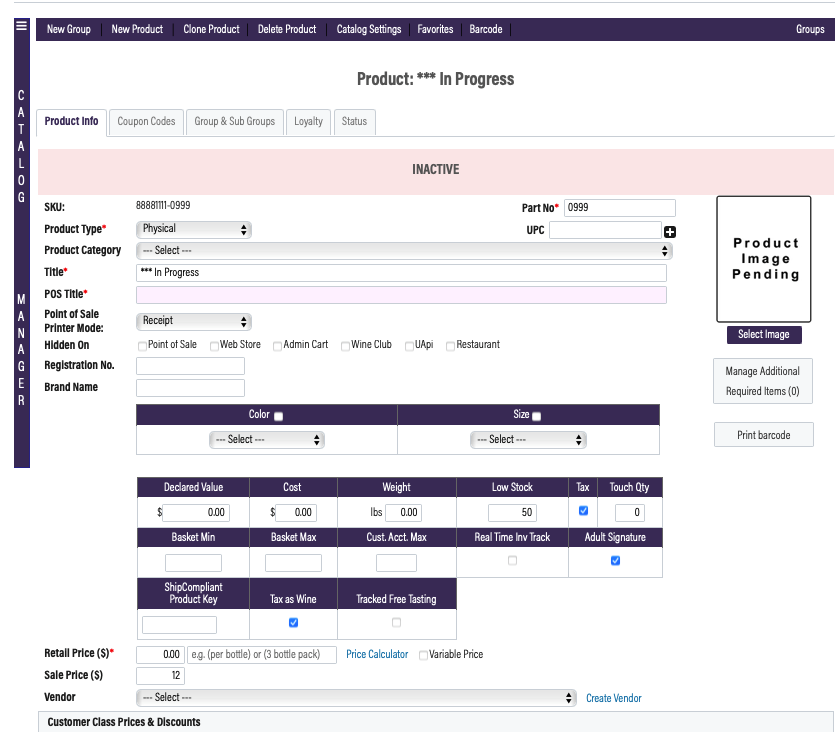 Open the Catalog manager module which is located under Products. At the top of the Catalog, the manager selects New Product. Wine Products are the default for any new product so you will need to change the product type. The product type should be set to physical. Now fill out at minimum the Title, POS Title. Retail Price, Case Qty, and if you want this product to be taxed.