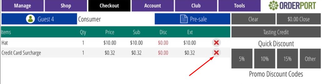 If you decide to use the fees tab to set up a credit card surcharge, there are a few limitations you need to be aware of. In OrderPort, we do not have the ability to apply a fee after a payment type is selected, so you can only use Credit Card fees on the Point of Sale or Restaurant applications. For all non-credit card charges, including debit cards, the winery must manually remove the credit card fee from the transaction at checkout by clicking the (x).