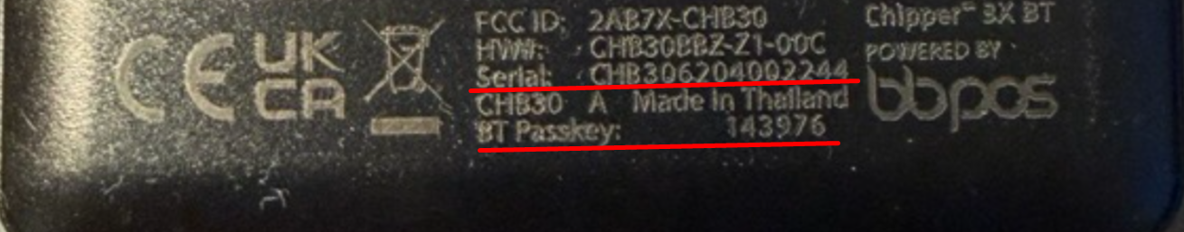 - Look on the back of your card reader to find the serial number. It will be printed in very small text. Please note: For serial numbers beginning with CHB3, there is a BT passkey located on the back of the reader below the serial number. This will be needed in later steps and should be recorded. (You may want to use your phone to take a photo and enlarge it to read the small print.)