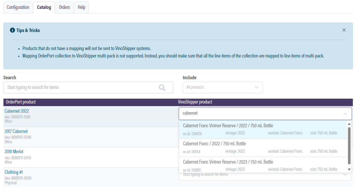 SKU: If you select the SKU option, you must set the product SKUs in Vinoshipper to match those in the OrderPort Catalog Manager. Please avoid adding a variety of product types within a single collection (wine products with physical products).