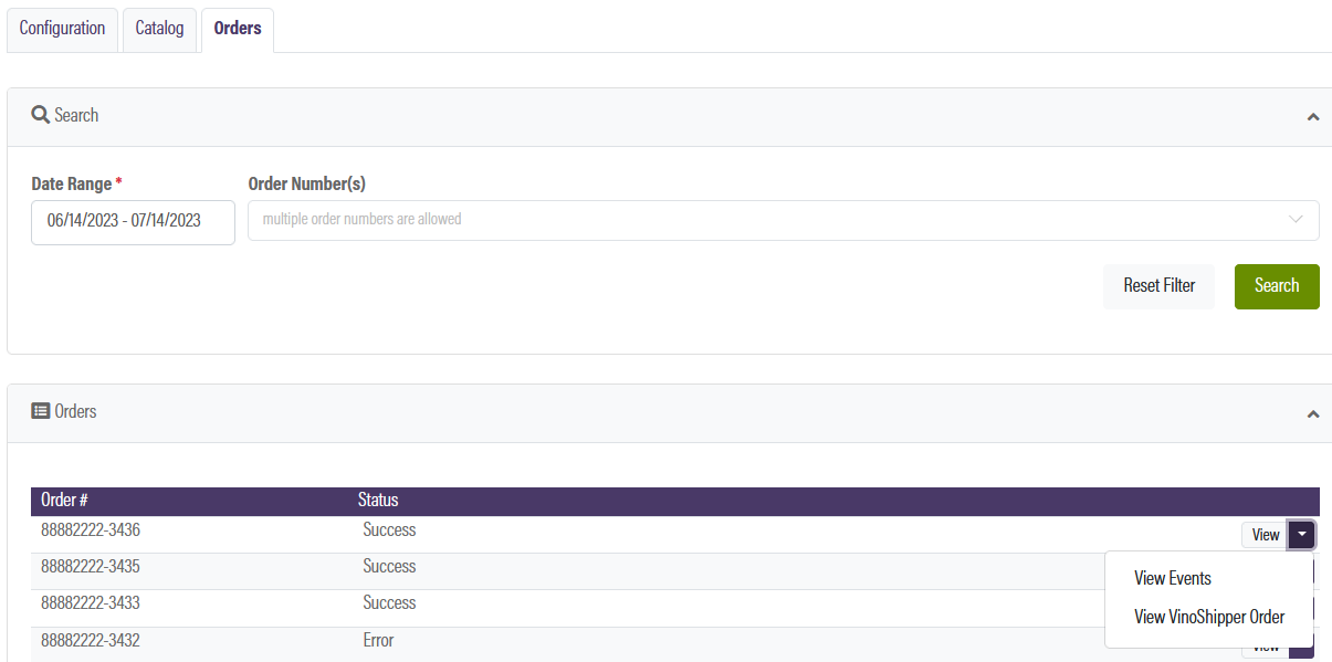 The Orders page allows you to view all your Vinoshipper orders. Clicking View opens the order in OrderPort. Under the dropdown, View Events shows you the order logs. View Vinoshipper Order shows you Vinoshipper logs. You can use these logs to trace the root issue of a failed order. Please see the troubleshooting section below for more information.