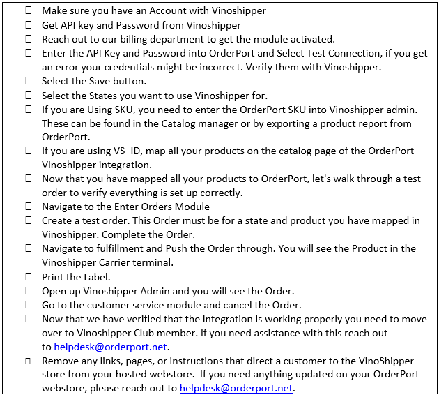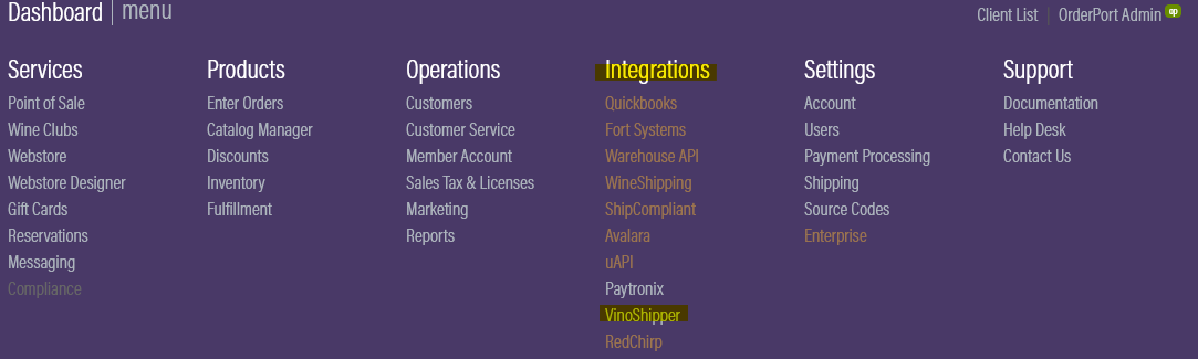 Integration setup is done in OrderPort Admin > Integrations > Vinoshipper. Please see this Vinoshipper document for how to get the API information: https://vinoshipper.freshdesk.com/support/solutions/articles/9000230450-orderport-and-vinoshipper-integration-user-guide.
