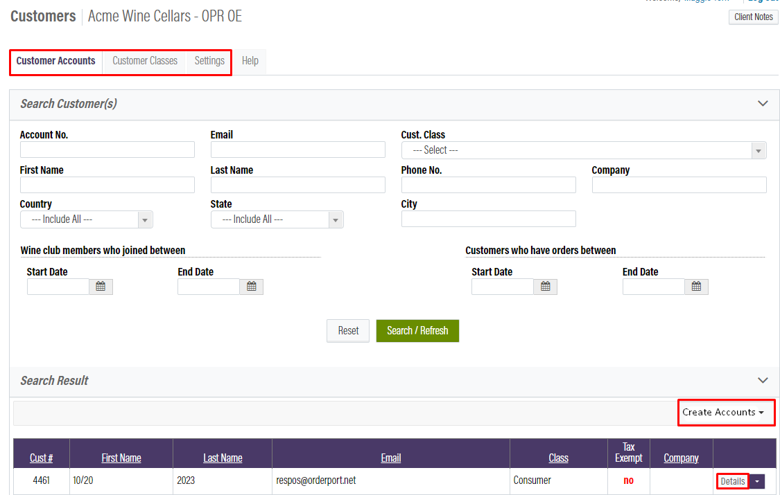 - The customer accounts page allows you to search for specific customers or view a list of all customer accounts in your winery.