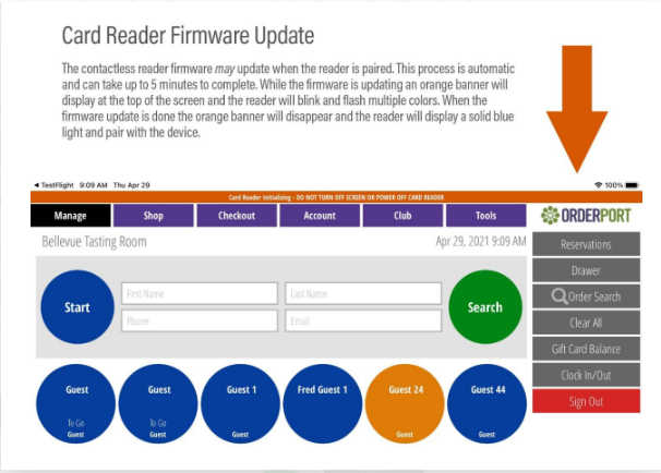 Note that these readers will allow touchless payments through Near Field Communication (NFC). This includes credit cards with the touchless symbol or ApplePay/GooglePay on a cell phone. The readers also support EMV chip cards. Swiping cards is no longer a valid method, so the card swiper will not function. For these readers, your payment processor will be OrderPort Payments powered by Stripe.
