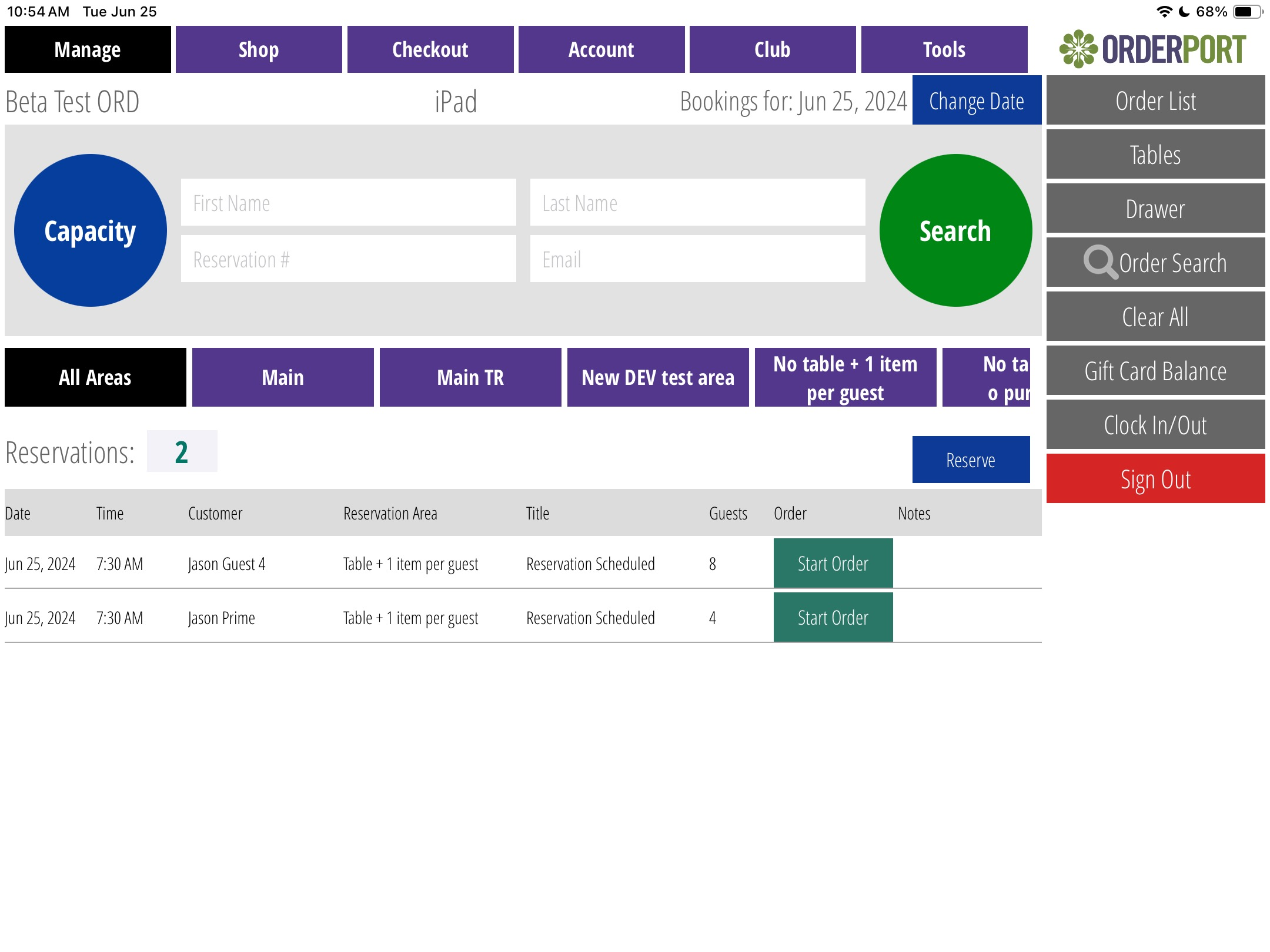 The reservations tab on the OrderPort app allows you to see existing reservations. On the right-hand side of the app in the gray bar will be a button titled Reservations. After selecting this you will be brought to a screen with all your reservations areas for this tasting room location.