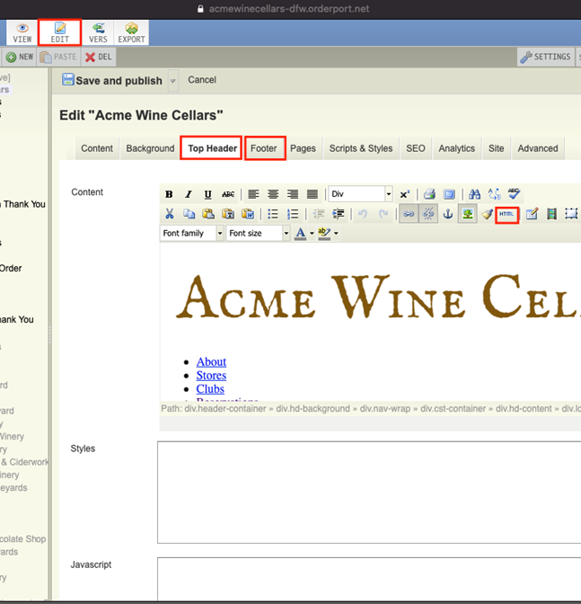 In order to utilize the ADA Accessibility Widget, you must generate the widget on https://userway.org/ by providing the URL address of your OrderPort hosted web store, for example for our acme test web site: (https://acmewinecellars.orderport.net/) If you already utilize an ADA widget a new one must be created as your current one is likely already registered to your site and not OrderPort site. Once you have the text go to webstore designer and select Edit. Then choose Analytics. Paste your script into the Body Bottom Scripts. Save and publish.
