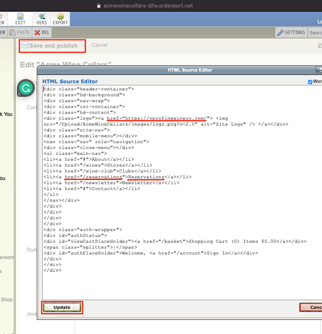 To change the link there are two Options the link may appear as a shortcut. If this is the case and you want to shortcut it to another OrderPort hosted page change the shortcut to the world after the / of the link. For example, href=“/reservations” is the shortcut of https://acmewinecellars.orderport.net/reservations . If you are not linking to an OrderPort Page then import the full HTML link. Update and save and Publish Changes.
