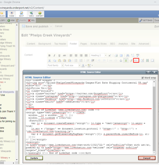 You will first need the HTML code/script for the live chat. In the Webstore designer select Edit and the the footer tab. Select the HTML button. Paste the script provided by your chat service below the </div> line. Click on Update, then click Save and Publish on the top left.