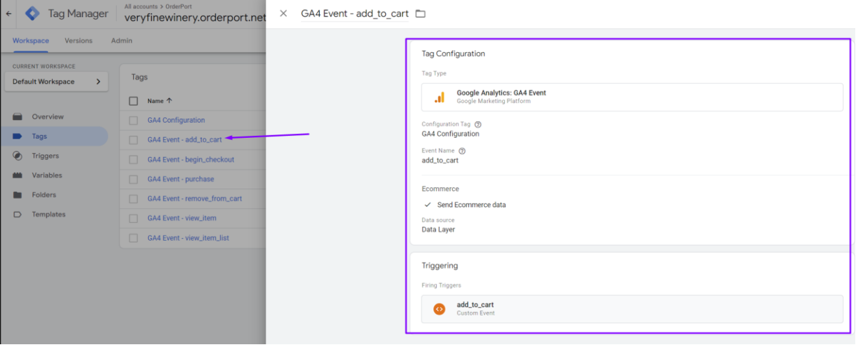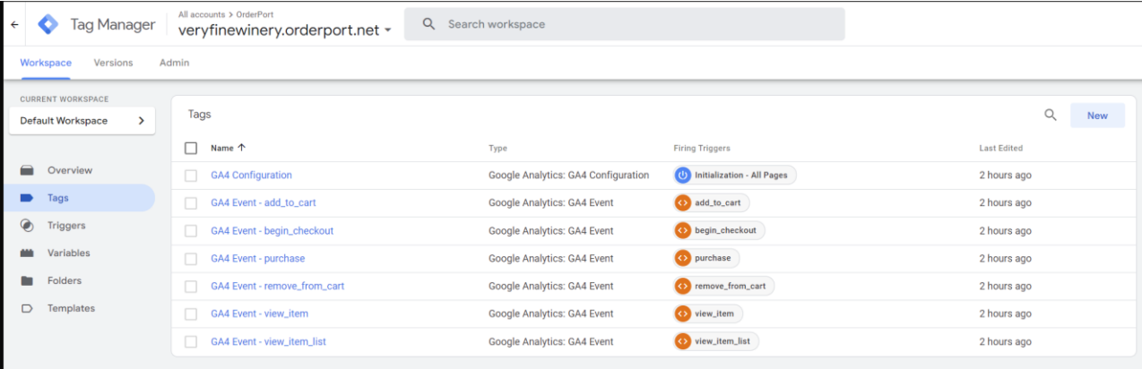 Before you configure your OrderPort webstore for Google Tag Manager you will need a Google account properly configured. You can learn more about Google Tag Manager here. Below are a few screenshots from the Google Tag Manager portal with a demo account that was previously configured: