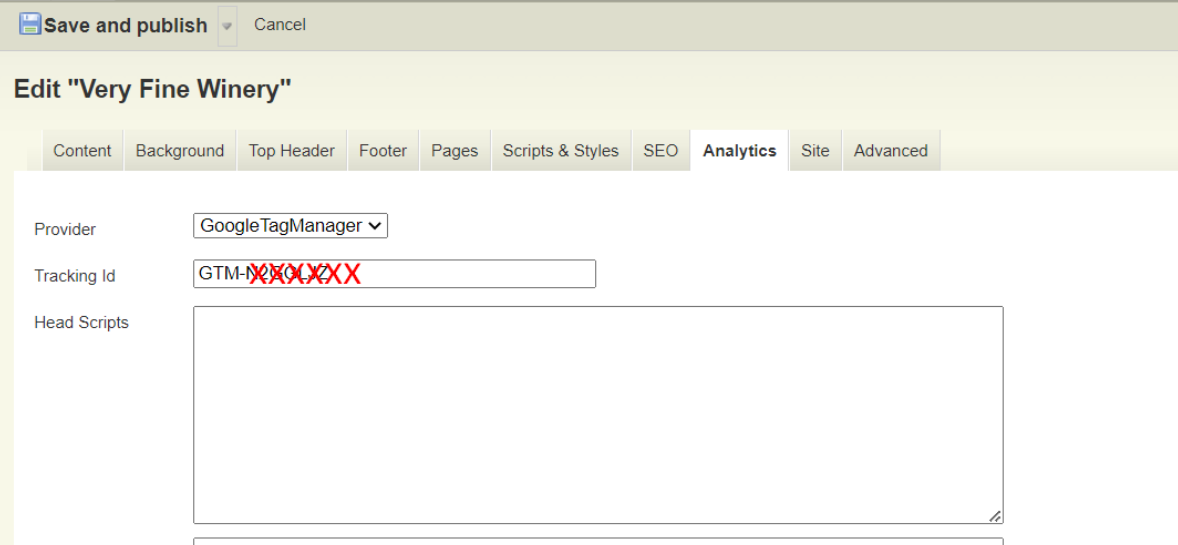 After retrieving the Tracking ID Go to the Webstore designer. Click on the edit button at the top of the screen and find the analytics tab. Select your provider as Google Tag Manager. Enter your GTM Tracking If in the Tracking ID slot. Save and Publish.