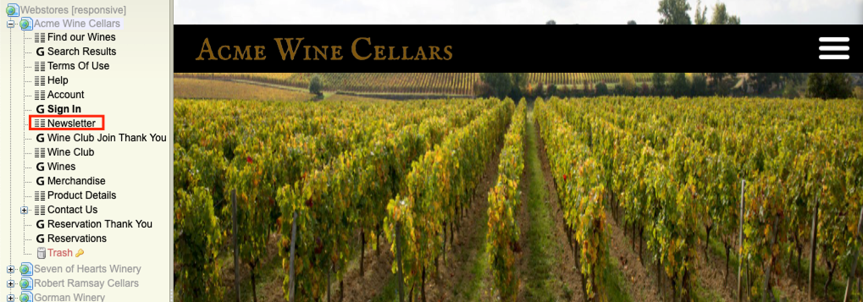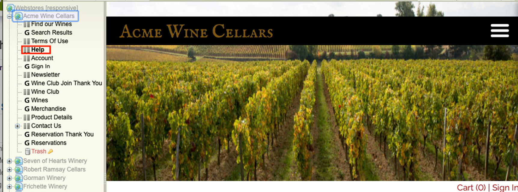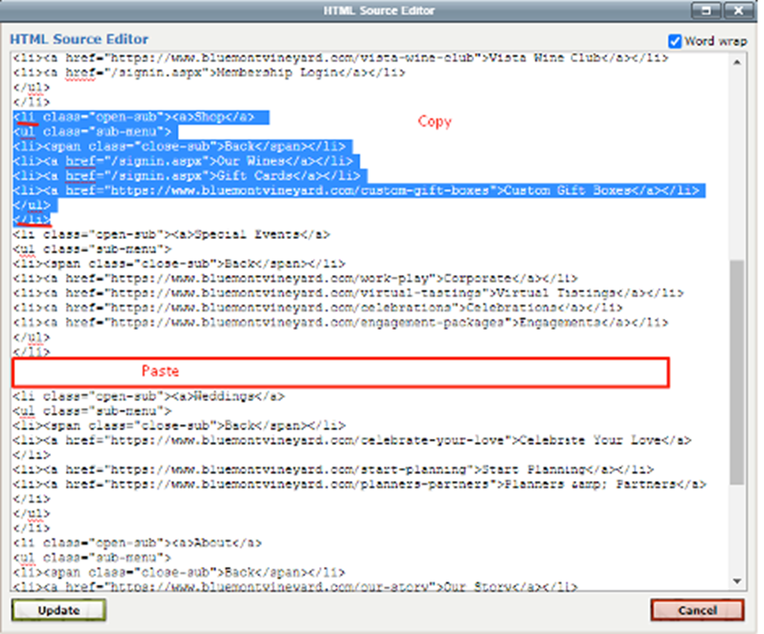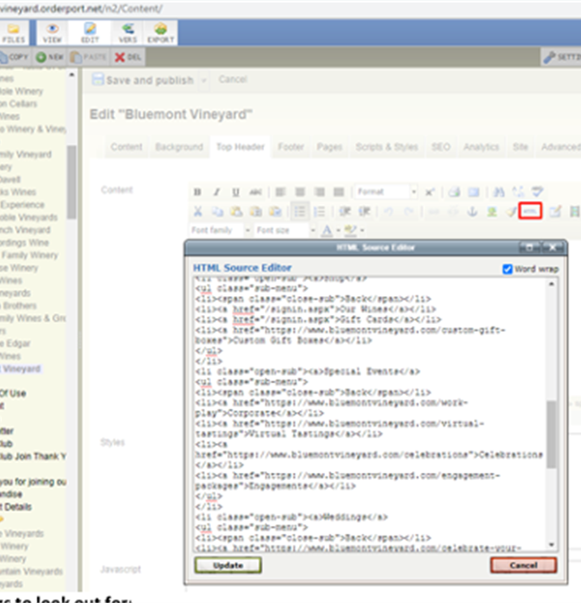 If a winery currently has a submenu implemented in CSS, below are the steps to add it to another section on the header menu. If a winery does not have an existing submenu, this would be considered a web-store request that needs to be completed by the helpdesk.