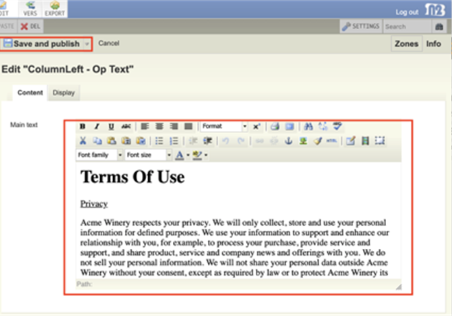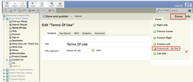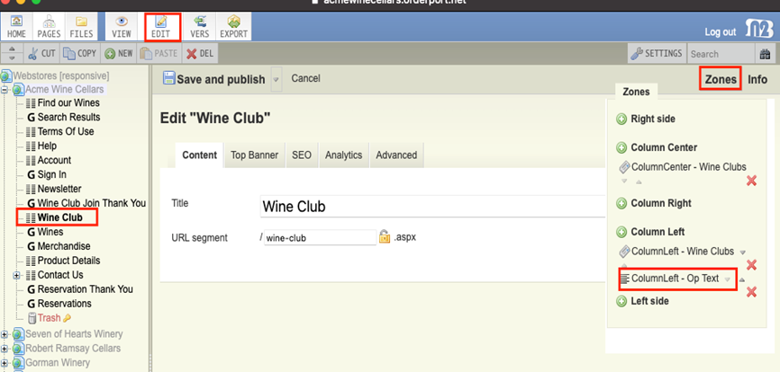 From the webstore designer module select the wine club page and click “Edit” at the top of the page. On the top right-hand side click “Zones” and then “ColumnLeft –Op Text”. Edit the desired information and then “Save and publish.” It will ask you to do this twice.