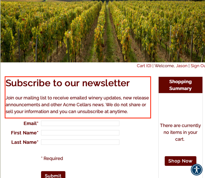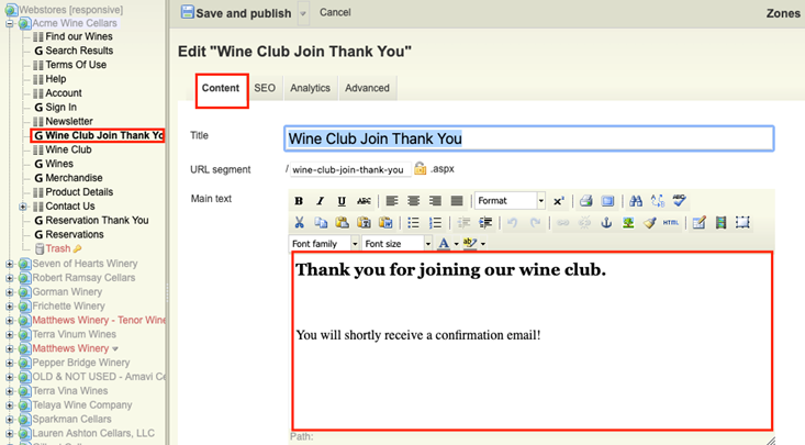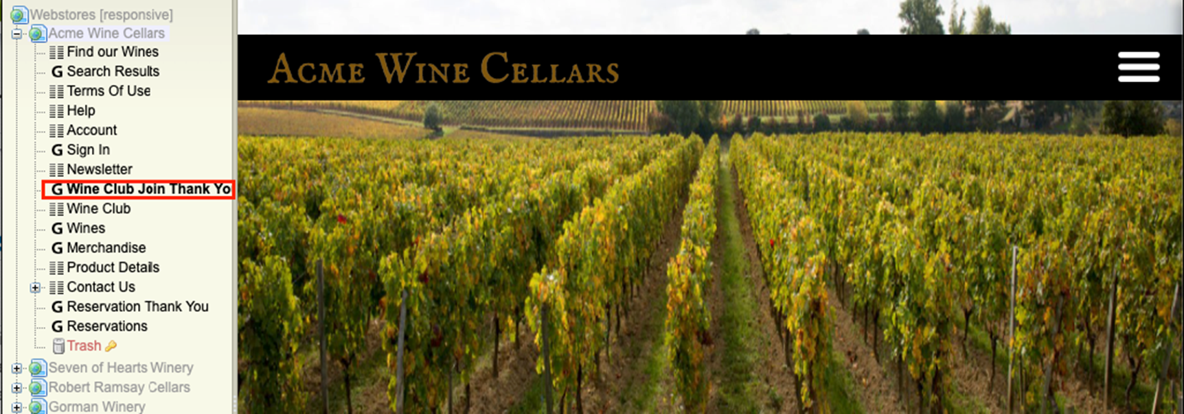 The Wine Club Join Thank You page is where you can edit what text displays after someone joins the wine club from the webstore.
