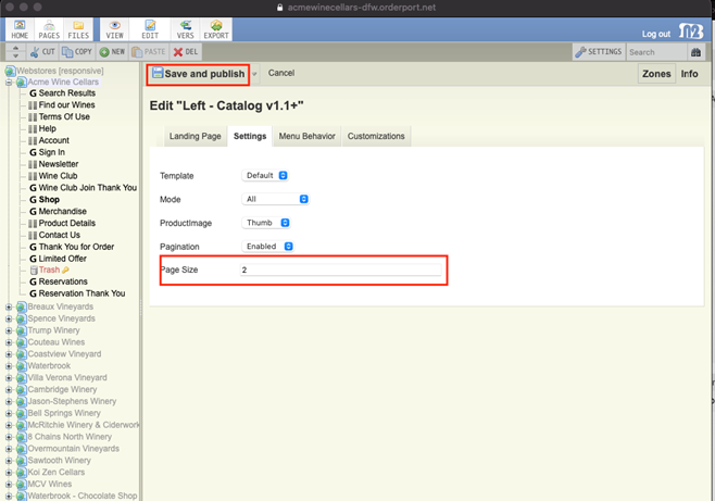 From Webstore designer, select ”Wines" on the lefthand side of the page. Then select edit from the top menu. Next, look for the tab labeled "Zones" on the top right hand corner. Once you have selected "Zones", look for the category "left side" in the Zones drop-down menu. Select the subcategory "Left – catalog v1.1". Select "settings" and page size field. Set the number of items you wish to appear on the page. (In most cases the default is 10). Once you have made the change, select "save and publish" at the top of the page and your changes will be live.
