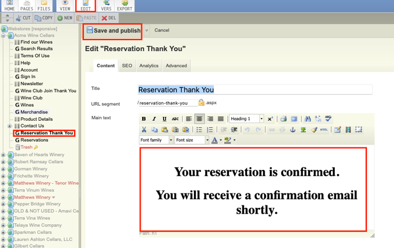 The Reservations Thank You page is where you can edit what text displays after makes a reservation from the webstore.