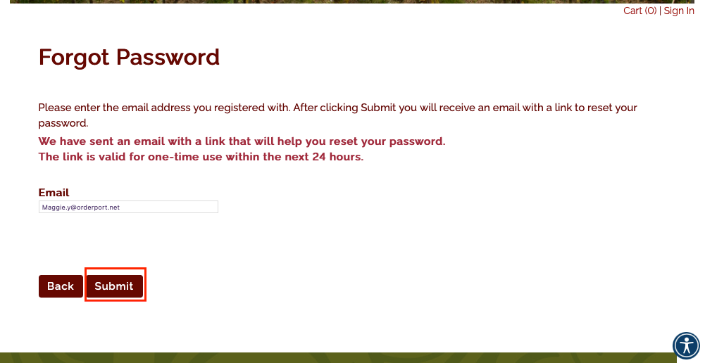 Clicking the reset password link from the email should take the customer back to the webstore sign in page however it should then provide a pop-up that prompts the customer to enter in a new password and submit, then they will be able to sign in at that screen using that new password. If customers are not seeing this pop-up after clicking the link, have them check their browser settings if pop-ups are disabled and to enable them.