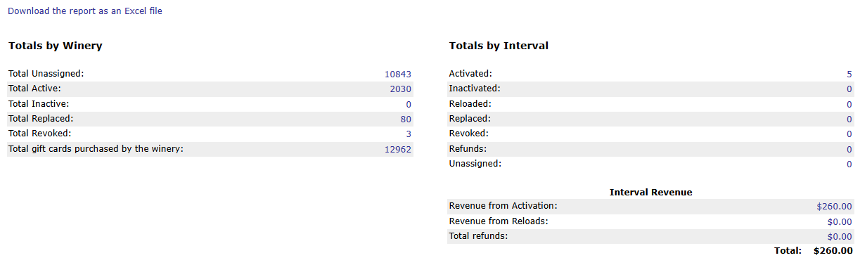 This report displays the total working time of tasting room associates, along with their tips. For more information on this report, please see the Reading the User Time Card Report document.