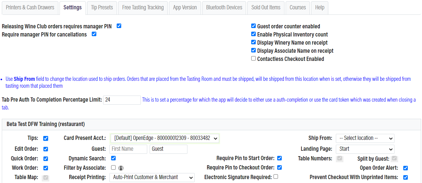 At the top of the screen are Universal Settings, which apply to all tasting room and restaurant locations. Below are the Individual Location Settings, which allow you to customize settings for each business location independently. If a location is designated as a restaurant, the word (restaurant) will appear in parentheses next to the location name.