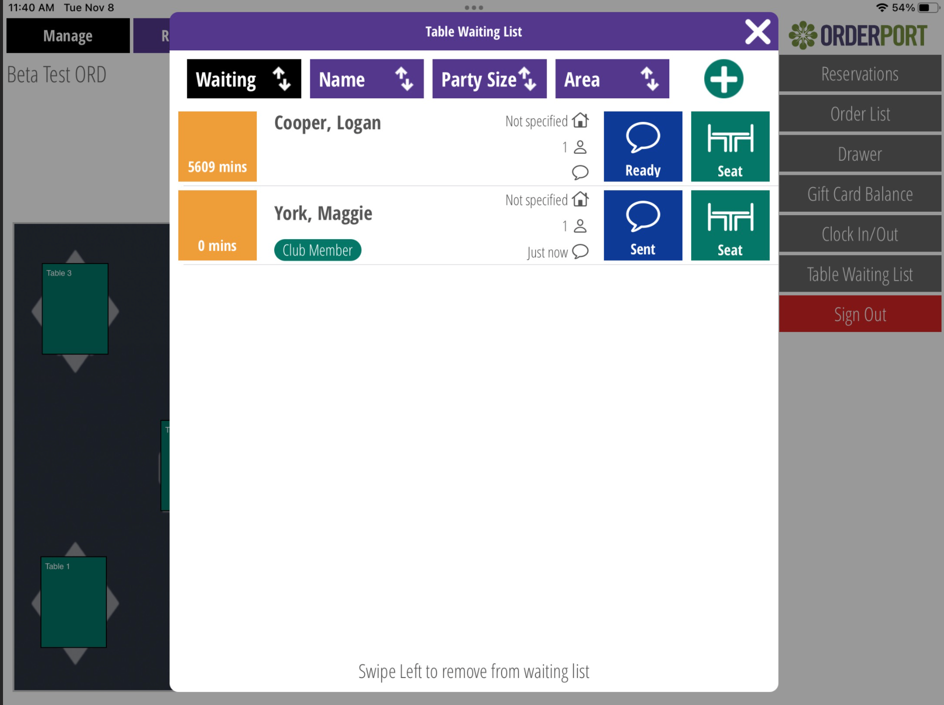 OrderPort Restaurant Two includes a Table Waiting List button on the left-hand side. This feature allows you to add customers to a waiting list. The list shows how long each customer has been waiting and allows you to seat them directly from this page.