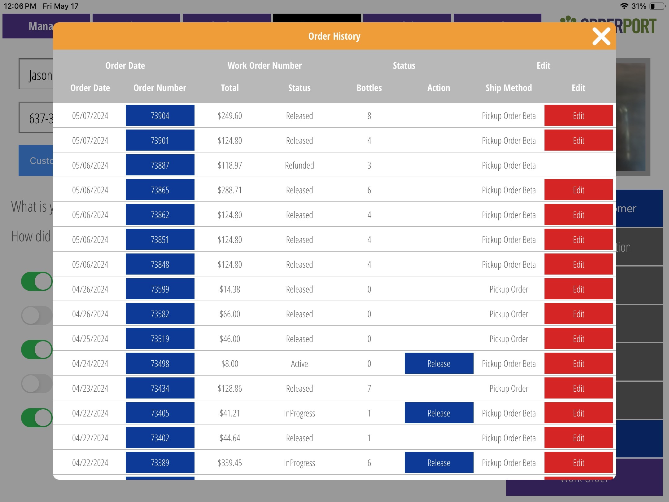 You can also edit an order through the Account tab. After searching for a customer, select the Order History button. A list of all the customers’ associated orders will appear. Next to each order is a red Edit Order button.