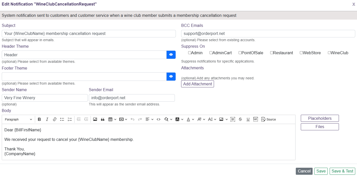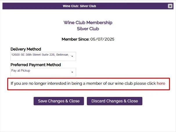 When clicked, a customizable notification is sent to both the customer and the winery. You can edit this message in OrderPort Admin -> Marketing -> Notifications -> "WineClubCancellationRequest".