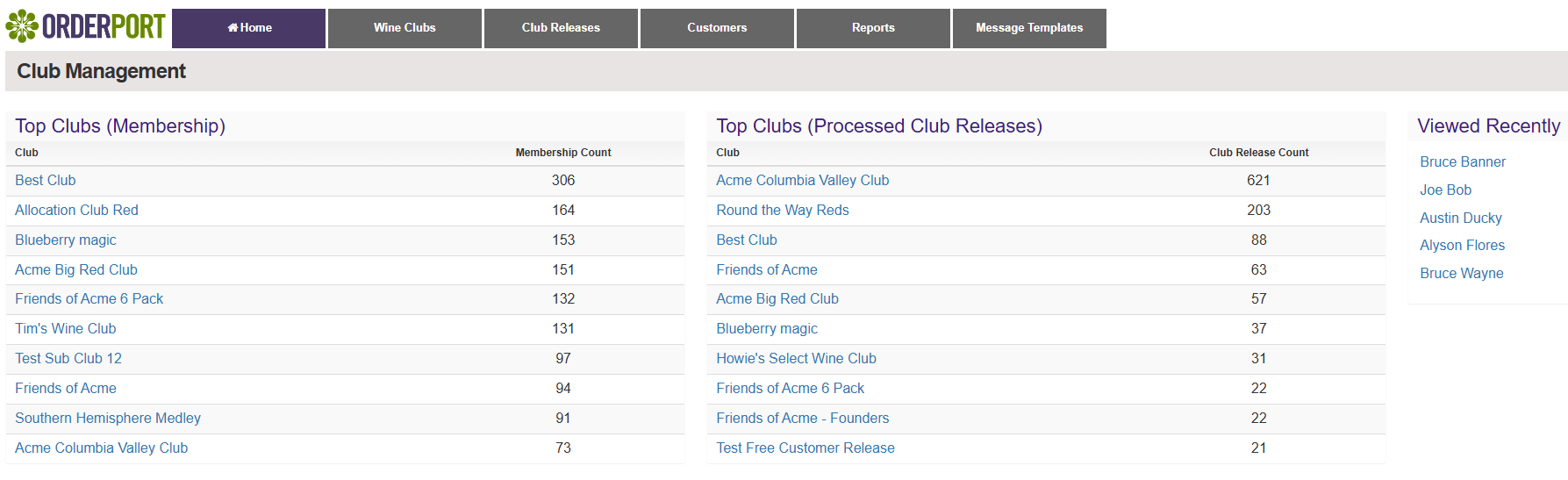 This page is your wine club dashboard, and it gives you some statistics about your clubs and recently viewed club members.