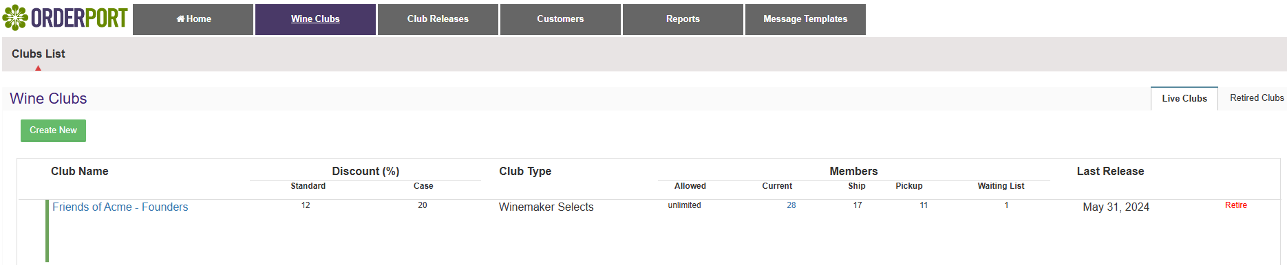 This tab is where you can view all of your live and retired wine clubs. After clicking on the name of a club, it will bring you to the Edit Club tab. From here, you can adjust all the settings that were set up when you created the club. This includes editing the name, discounts, and club-type fields.