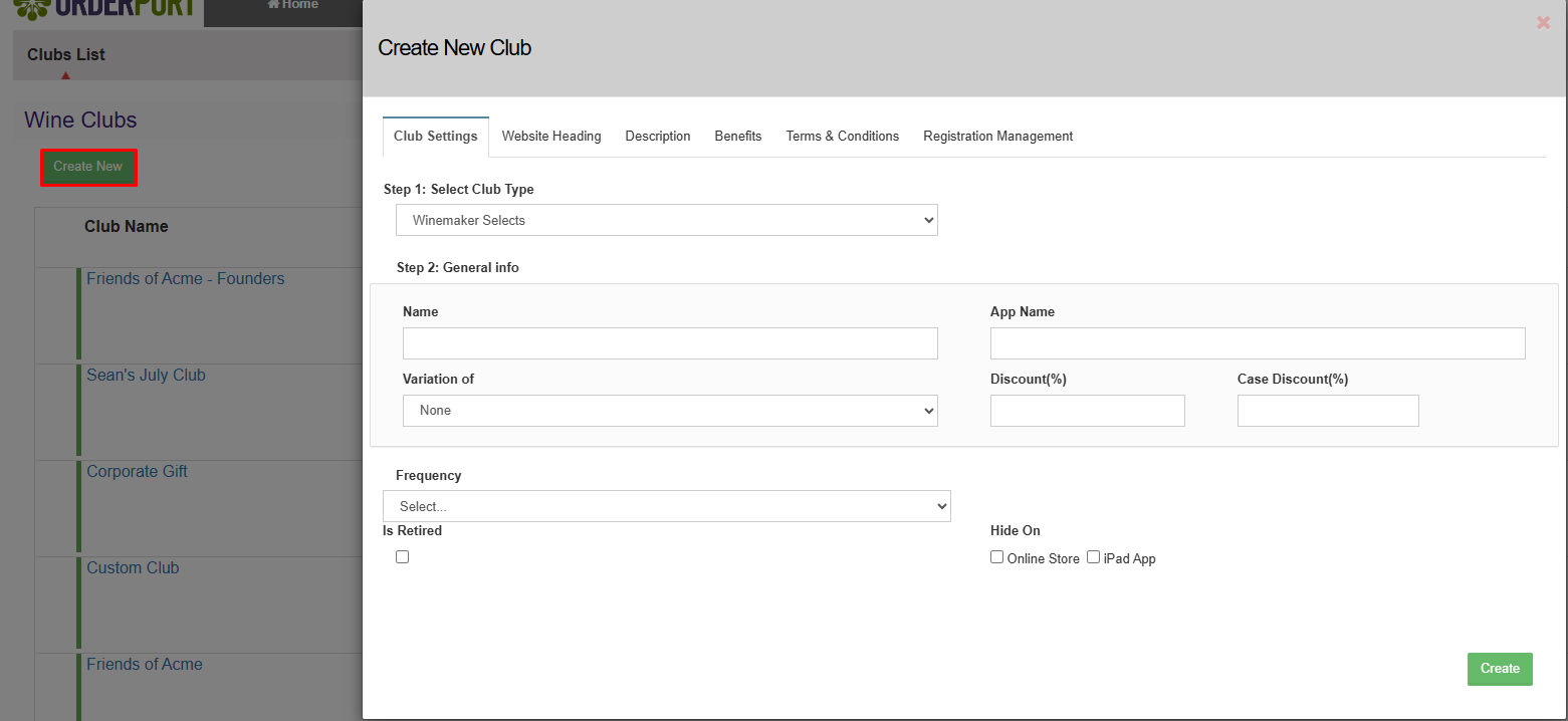 In the Wine Club module, navigate to the Wine Club tab. From there, you will see a "Create New+" button. Once you click on the Create New button, a pop-up window will appear where you enter the specific club information.