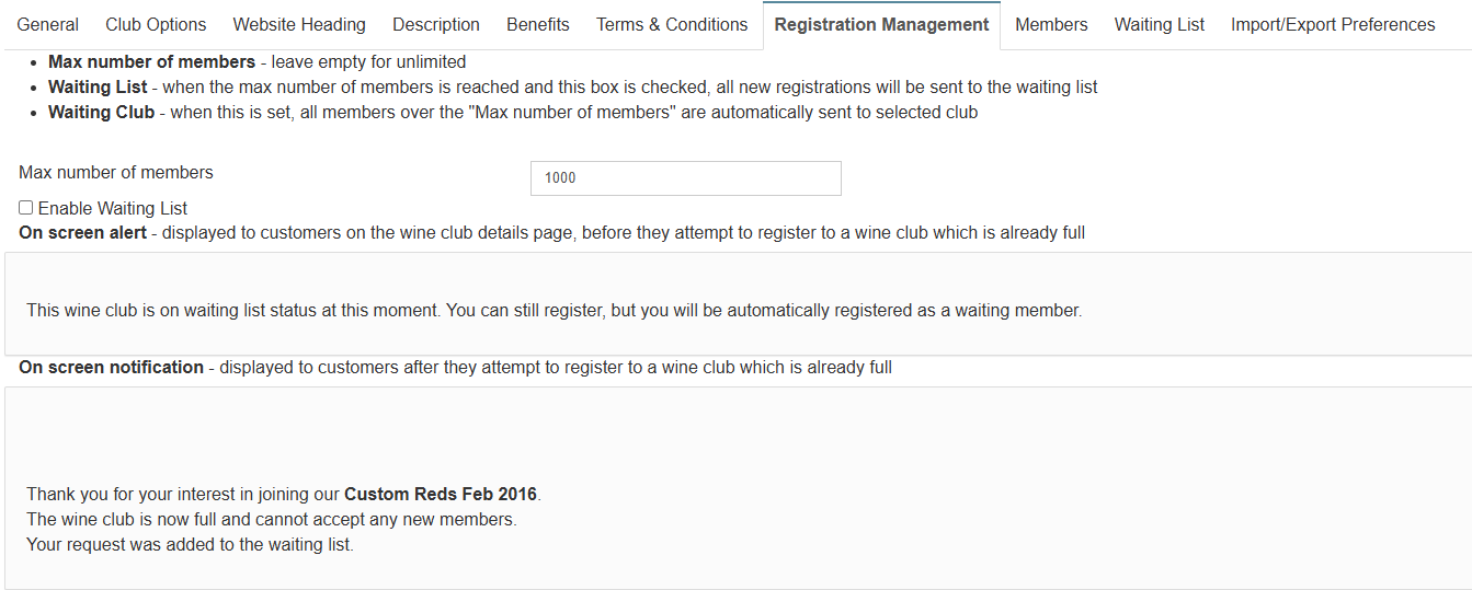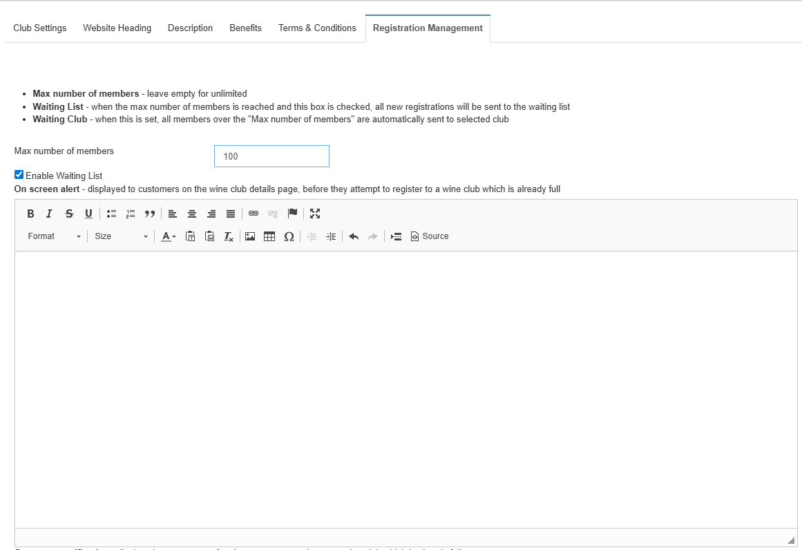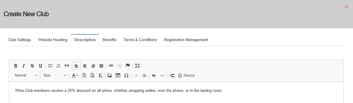 If you plan on making this club available for sign-ups on the web store, you will fill out the Website Heading, Description, Benefits, and Terms & Conditions tabs. The information entered here is what customers will see when they view the club on your webstore. In the picture below, we see an example describing the club. Enter your text and click Save Changes. Follow the same steps for Website Heading, Benefits and Terms & Conditions. This information will also show on the iPad if signing someone up in your tasting room.