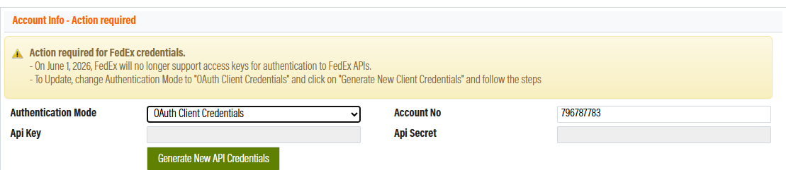 If you have been using FedEx access keys for the integration previously, you must migrate to the OAuth Client Credentials mode. FedEx will stop supporting access keys in 2026.