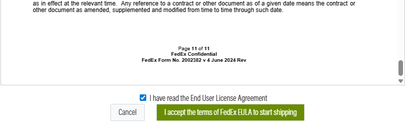 Step 1 will be to read and accept the End User Licence Agreement from FedEx. You must scroll to the bottom of the document before you can click the "I have read the End User Licenses Agreement" checkbox and accept the terms to move on to step 2.