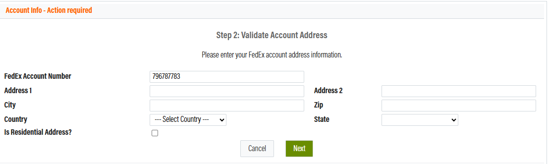 In Step 2, you will be asked for an address. Please enter your FedEx billing address here.
